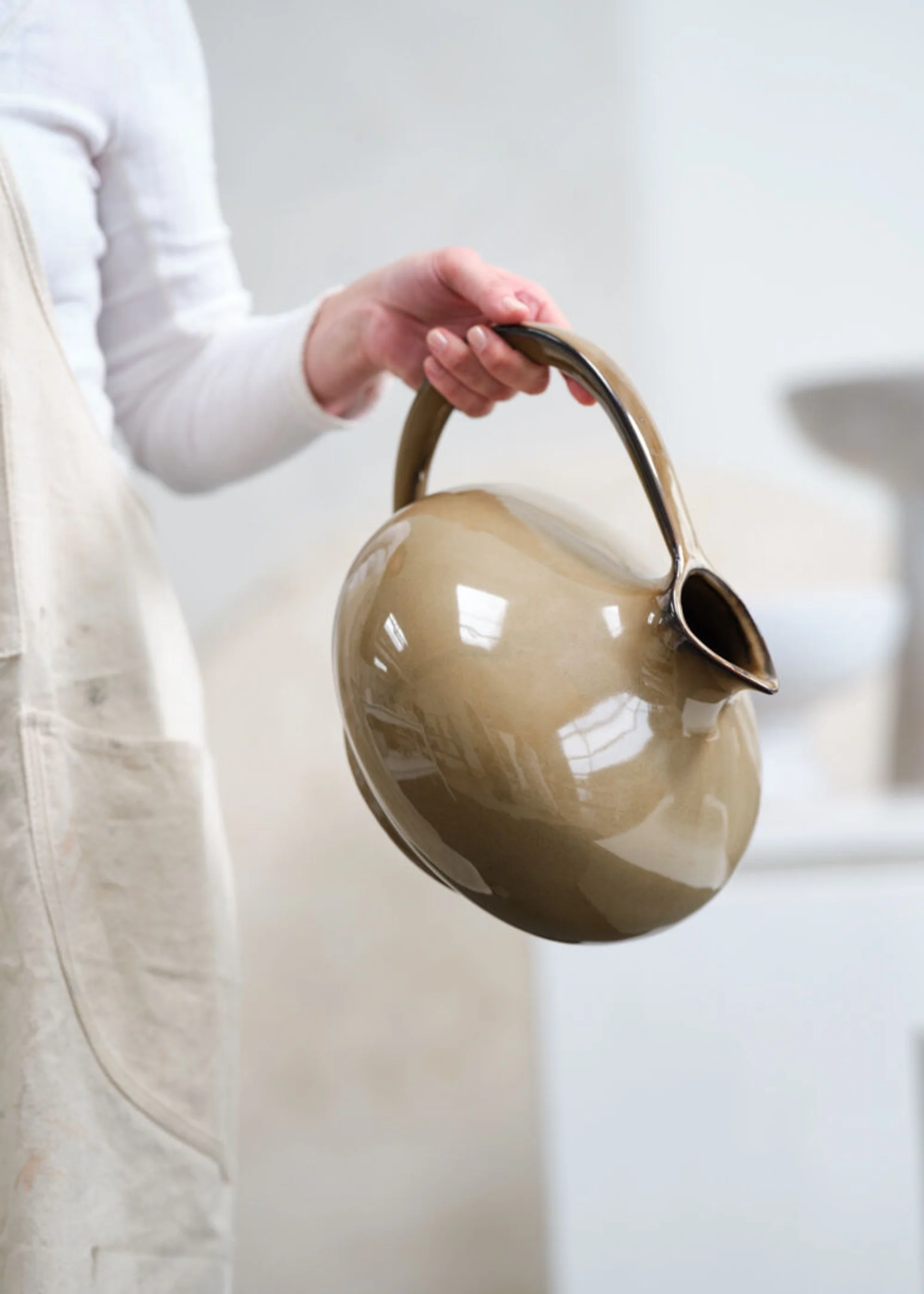Create a sophisticated statement piece with the Serpentine pitcher vase, a large ceramic vessel showcasing a smooth and glossy finish in a warm, rich caramel-brown glaze. Blending timeless old-world charm with modern design, this artfully crafted pitcher boasts a dramatic, curved handle that creates a visually attractive silhouette. Style it with dried flowers or faux stems, and you have an impressive floral arrangement that transforms any table in your home into a captivating focal point.